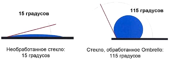 Частицы Омбрелло присоединяются к молекулам стекла заполняя неровности и позволяют поверхности отторгать Пинап и воду.